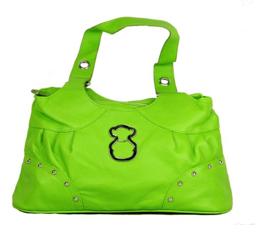 Bright lime green handbag features a shiny silver decorative emblem, matching studs and (2) shoulder straps