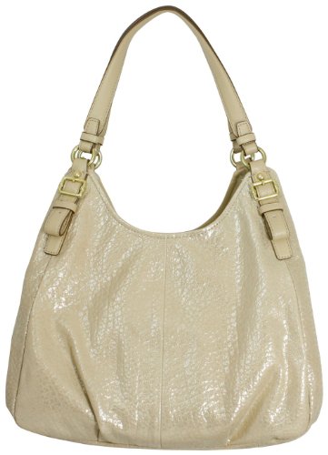 This coach Madison embossed metallic leather handbag is called the Maggie and is made with embossed metallic gold leather, and accented with gold brass hardware.